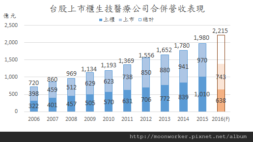 近十年,台灣生技公司的營收表現年年增加,甚至連金融海嘯時期亦不見營收衰退的情況,展望未來全球經濟發展和台灣老人化比率快速成長的趨勢下,生技類股的確值得我們長期關注。下圖為2006年到2016年台股上市櫃生技醫材公司合併營收表現。自2006年至2015年,上市櫃生技公司的合併營自720億元成長至1980億元,約以每年11.9%的速度成長。若以這個比率預估,2016年生技醫材類股的合併營收有機會達到2215億元。至於今年1-8月的表現方面(橘色部分),上市公司合併營收為743億元,YoY成長19.7%,上櫃公司合併營收則為638億元,YoY成長9.5%。上市櫃公司合計累積合併營收達1380億元,YoY成長14.7%。若以此成長率預估,今年合併營收或有機會達到2,270億元。
