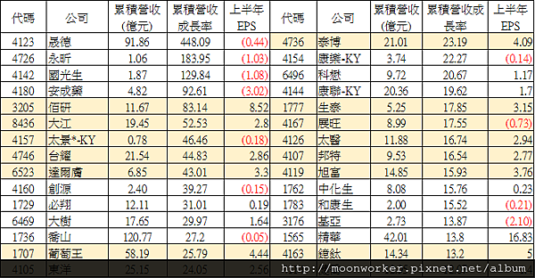 個股表現方面,104家上市櫃公司中,有60家至今年8月底止累積營收均較去年同期成長,成長幅度最高的前30家如下表所示,圖中黃色區塊代表今年1-8月合併營收為近三年最高者,但並非所有累積營收創新高者均呈現獲利,以累積營收成長率最高的前四家來看,上半年EPS都還呈現虧損狀態,僅可視為產品獲得客戶肯定,因此營收大幅成長,具有轉虧為盈的預期。
